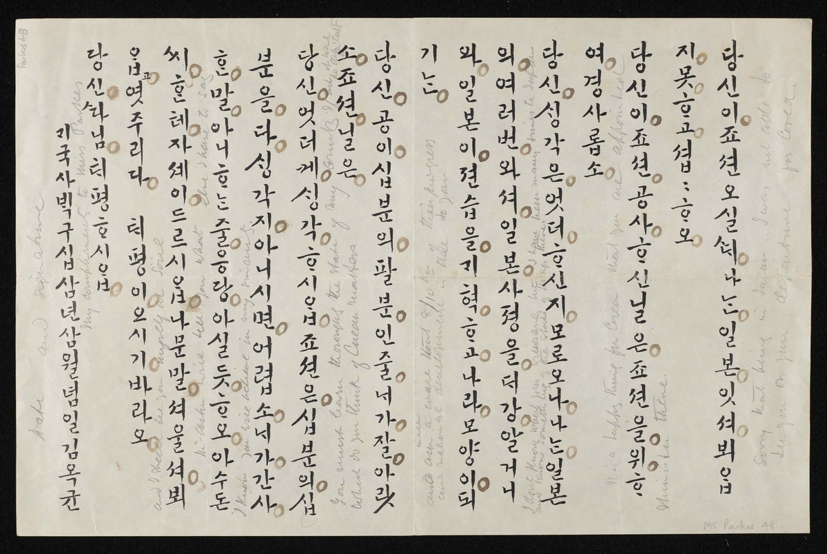 갑신정변을 주도했던 김옥균이 영국 외교관에게 보낸 것으로 추정되는 친필 한글 편지가 영국 케임브리지대학교 도서관에서 발견돼 학계가 주목하고 있다.