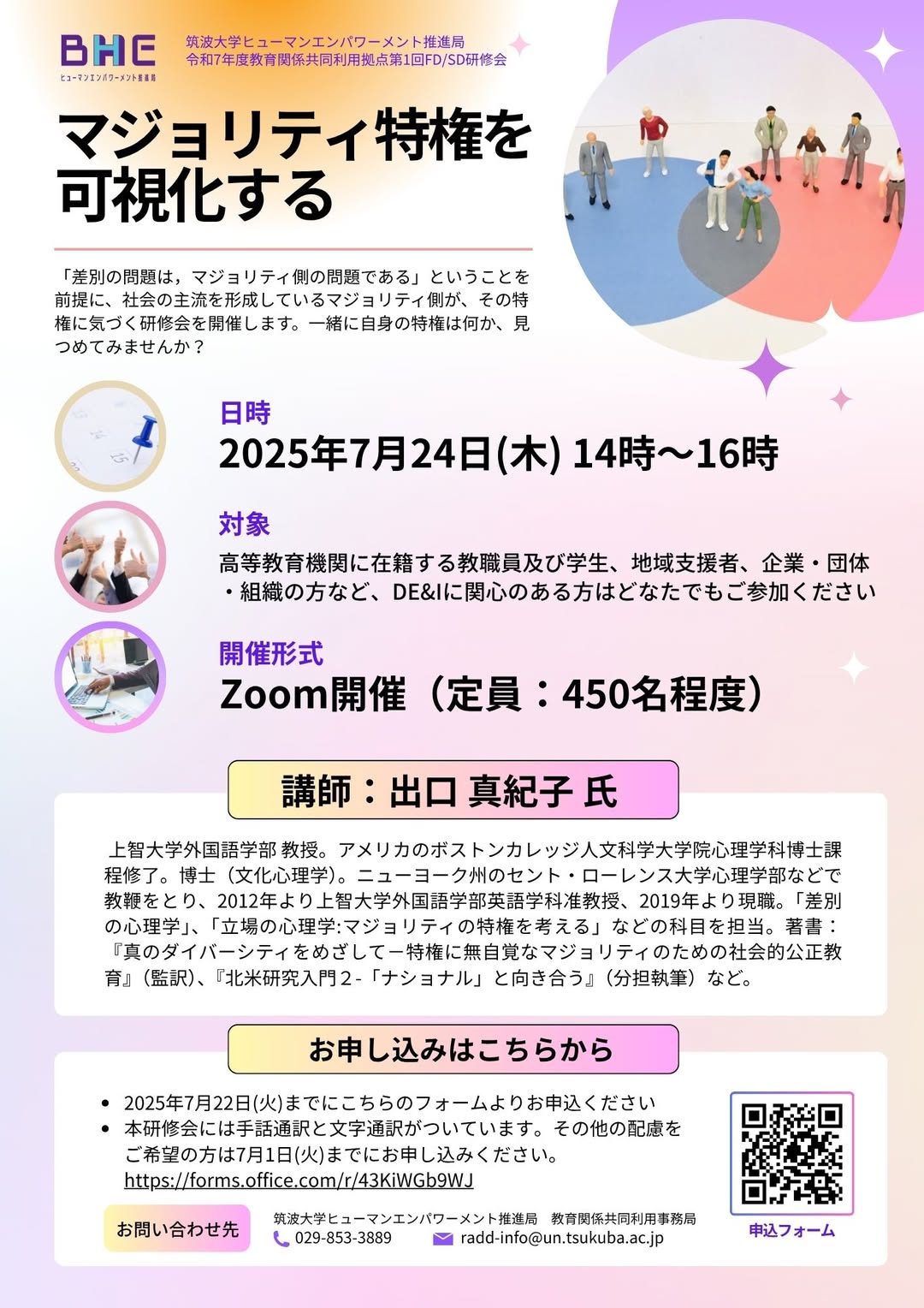 츠쿠바대학 휴먼임파워먼트추진국은 오는 7월 24일 오후 2시부터 4시까지 줌(Zoom)을 통해 ‘다수자 특권의 가시화’를 주제로 워크숍을 연다.