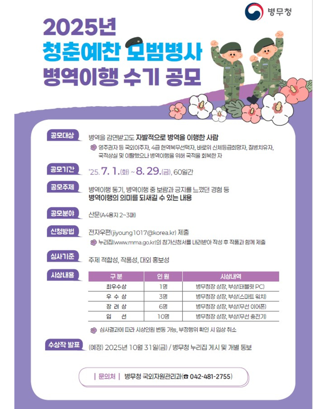 병무청이 병역 감면 대상임에도 자발적으로 병역 의무를 이행한 이들의 사연을 공유하는 「2025년 청춘예찬 모범병사 병역이행 수기 공모전」을 개최한다.