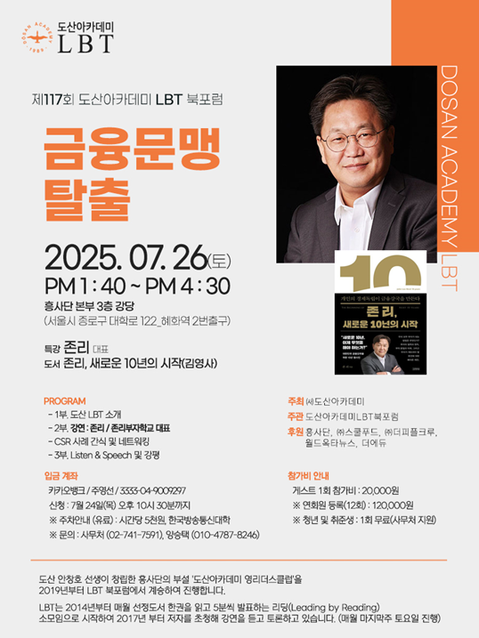 도산 LBT 포럼에서는 도산아카데미 청년이사 양승택의 주관으로 존리 대표를 초청해, 부의 본질과 미래, 투자철학과 원칙을 함께 모색하고자 한다. 이번 만남을 통해 우리는 올바른 경제관과 투자관을 세우고, 도산 안창호 선생이 강조한 수양과 실천, 나아가 이웃과 사회를 위한 봉사의 정신으로, 부에 대한 편견을 깨고 더 큰 공동체적 가치를 실현할 길에 대해 저자와 토크 형식으로 진행한다.
