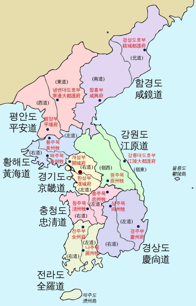 조선 초기부터 약 500년간 유지된 팔도는 경기도, 충청도, 전라도, 경상도, 강원도, 황해도, 평안도, 함경도로 구성된다. 각 도명은 두 개의 대표 고을 이름을 합쳐 지어졌으며, 이 명칭은 행정구역 명칭뿐 아니라 지역의 역사·문화적 정체성을 반영한다.