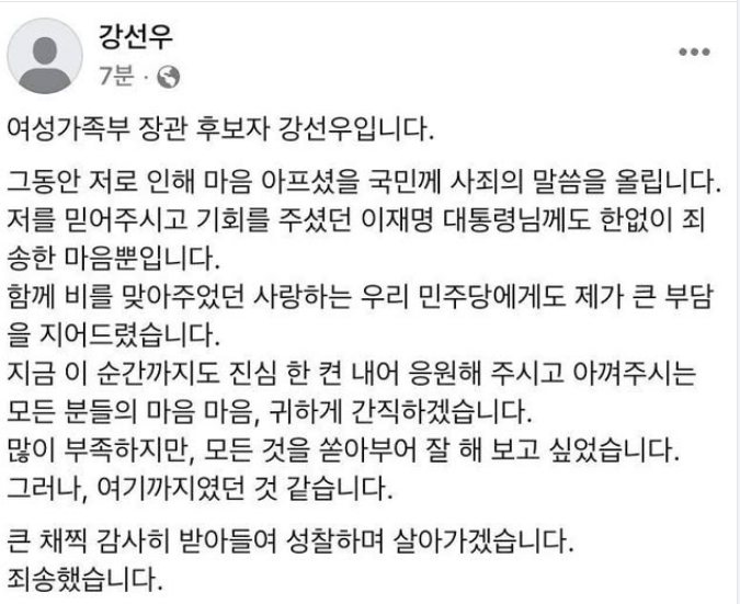 강선우 여성가족부 장관 후보자가 23일 오후 3시 52분경 전격 사의를 표명했다. 대통령실 대변인은 “강 후보자가 최근 제기된 보좌진 갑질 의혹과 거센 여론을 고려해 고심 끝에 책임지는 자세로 사의를 밝히기로 결정했다”고 전했다.