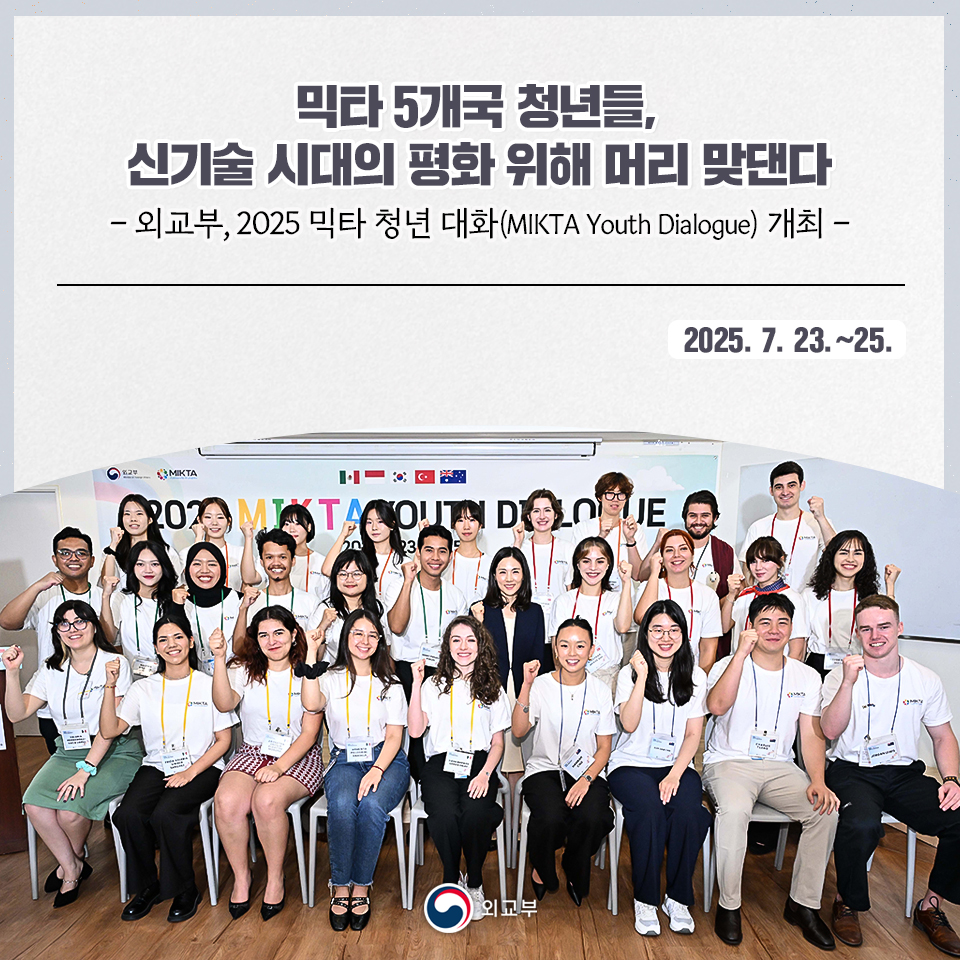외교부가 7월 23일부터 25일까지 사흘간 ‘2025 믹타 청년 대화(2025 MIKTA Youth Dialogue)’를 서울에서 개최했다. 이번 행사에는 믹타(MIKTA) 회원국인 한국, 멕시코, 인도네시아, 튀르키예, 호주에서 선발된 대학(원)생 28명이 참가했다. 국가별로는 한국 6명, 멕시코 6명, 인도네시아 6명, 튀르키예 6명, 호주 4명이 참여했다.