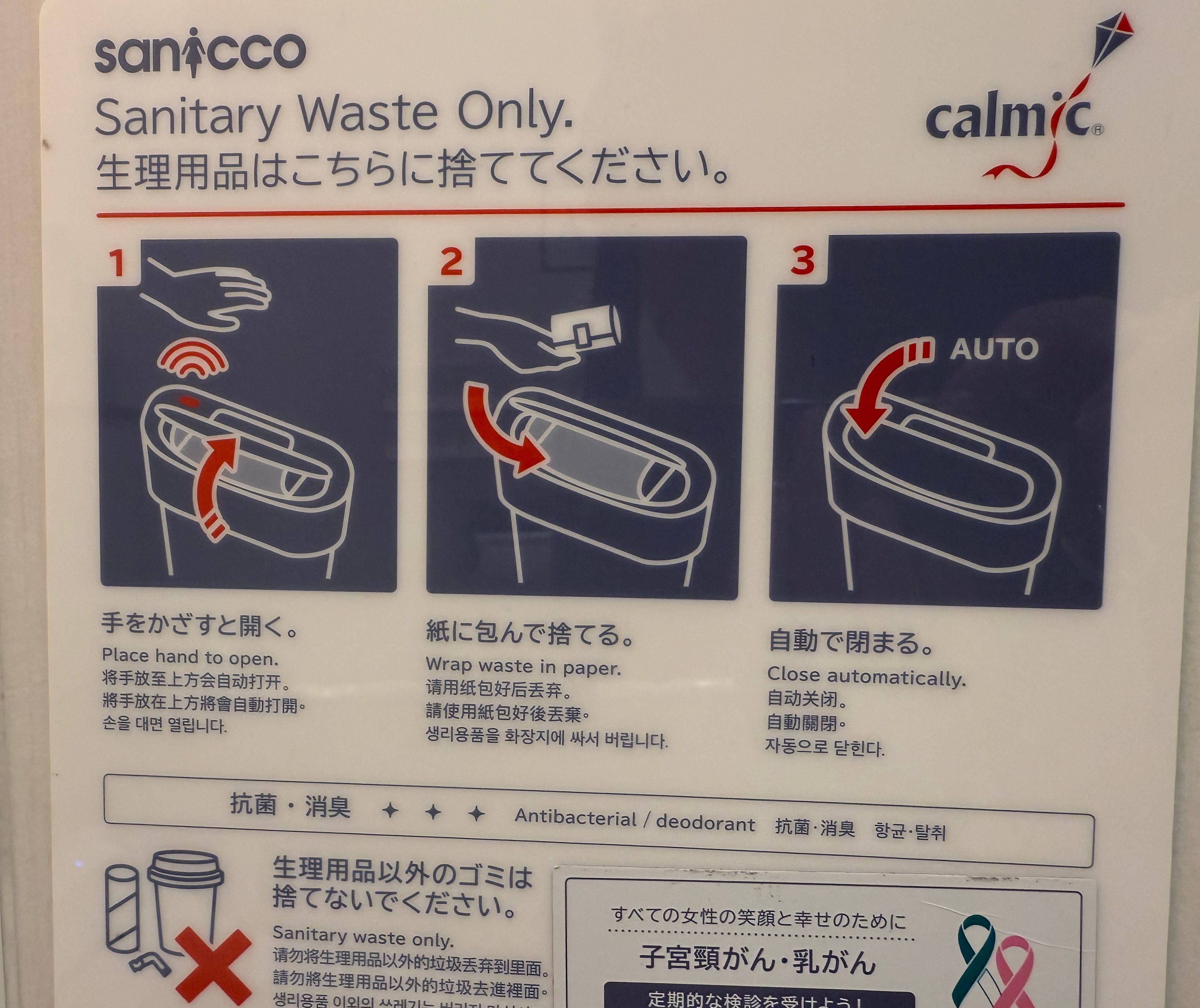 하지만 내가 진심으로 감탄한 부분은 따로 있다. 바로 여성용 화장실에 설치된 생리용품 전용 쓰레기통이다. 손을 대지 않고 센서에 손을 가까이 대면 뚜껑이 자동으로 열리고, 사용한 물품을 버리면 그 쓰레기는 내부에서 다시 닫혀 다른 사람에게 보이지 않도록 처리된다. 내가 버린 쓰레기도 바로 가려지고, 다음 사람은 아무것도 보지 않게 된다. 이 작은 구조물 하나에 담긴 배려와 기술은, 일본 화장실 문화의 정수를 보여주는 사례라고 생각한다.