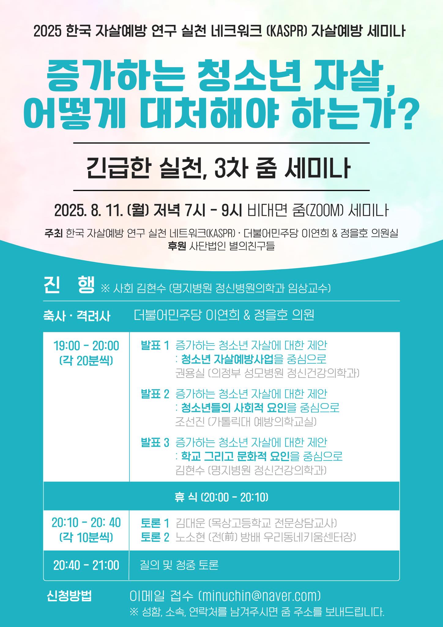한국 자살예방 연구 실천 네트워크(KASPR)가 8월 11일 저녁 7시부터 9시까지 ‘증가하는 청소년 자살, 어떻게 대처해야 하는가?’라는 주제로 온라인 세미나를 개최한다. 이번 세미나는 비대면 줌(ZOOM) 형식으로 진행되며, 더불어민주당 이연희·정을호 의원이 주최하고 사단법인 별의친구들이 후원한다.