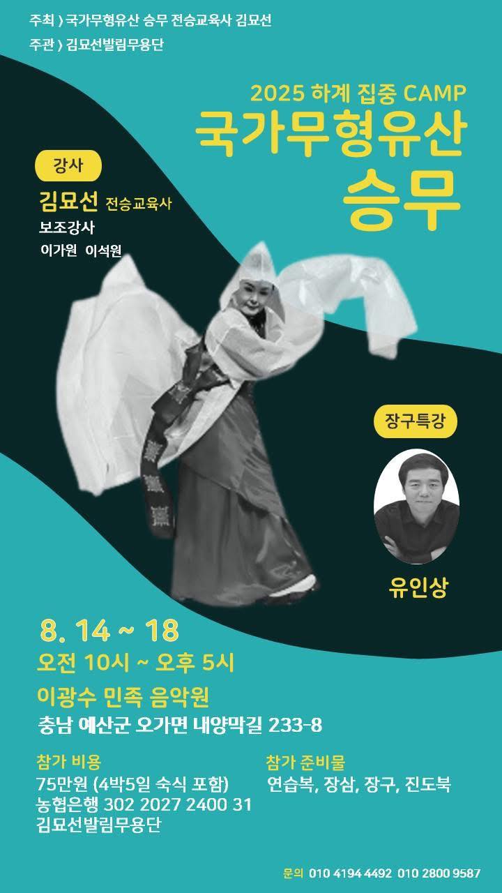 이번 캠프는 국가무형유산 승무 전승교육사 김묘선이 주최·주관하고, 김묘선발림무용단이 운영을 맡았다. 보조 강사로 이가원, 이석원이 참여하며, 장구 특강은 유인상이 진행한다. 참가자들은 오전 10시부터 오후 5시까지 승무 이론과 실기, 장구·북 연주 등을 집중적으로 익히게 된다.