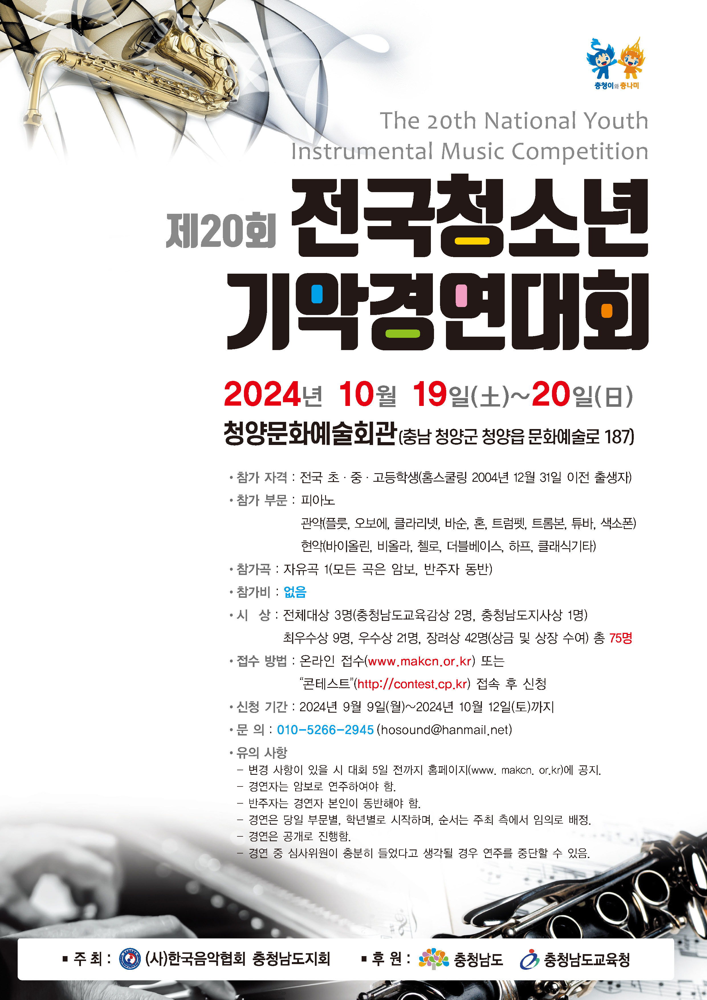 사단법인 한국음악협회 충청남도지회가 주최·주관하고 충청남도와 충청남도교육청이 후원하는 제21회 전국청소년기악경연대회가 오는 10월 열린다.