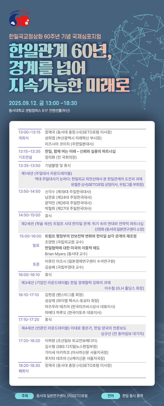 한일 국교 정상화 60주년을 기념하는 국제심포지엄이 오는 9월 12일 부산 동서대학교 센텀캠퍼스에서 열린다. 이번 행사는 동서대 일본연구센터와 사단법인 세토포럼이 공동 주최한다.