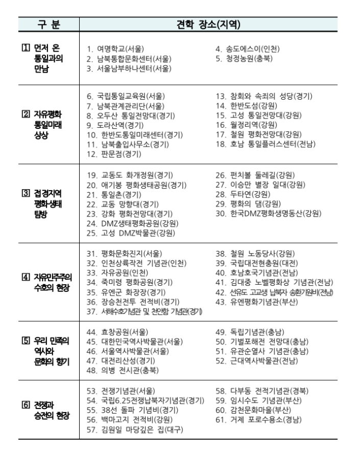 ‘유니투어’ 앱은 전국 60여 곳의 통일·안보 현장을 탐방할 수 있는 위치기반(GPS) 인증 기능을 통해 이용자들이 스마트폰으로 손쉽게 탐방 경로를 설계하고, 다양한 테마 코스를 선택하여 현장을 경험할 수 있다. 테마는 ‘먼저 온 통일’, ‘자유평화 통일미래’, ‘접경지역 생태탐방’ 등 6가지로 구성되어 있으며, 맞춤형 견학 경로도 가능하다.