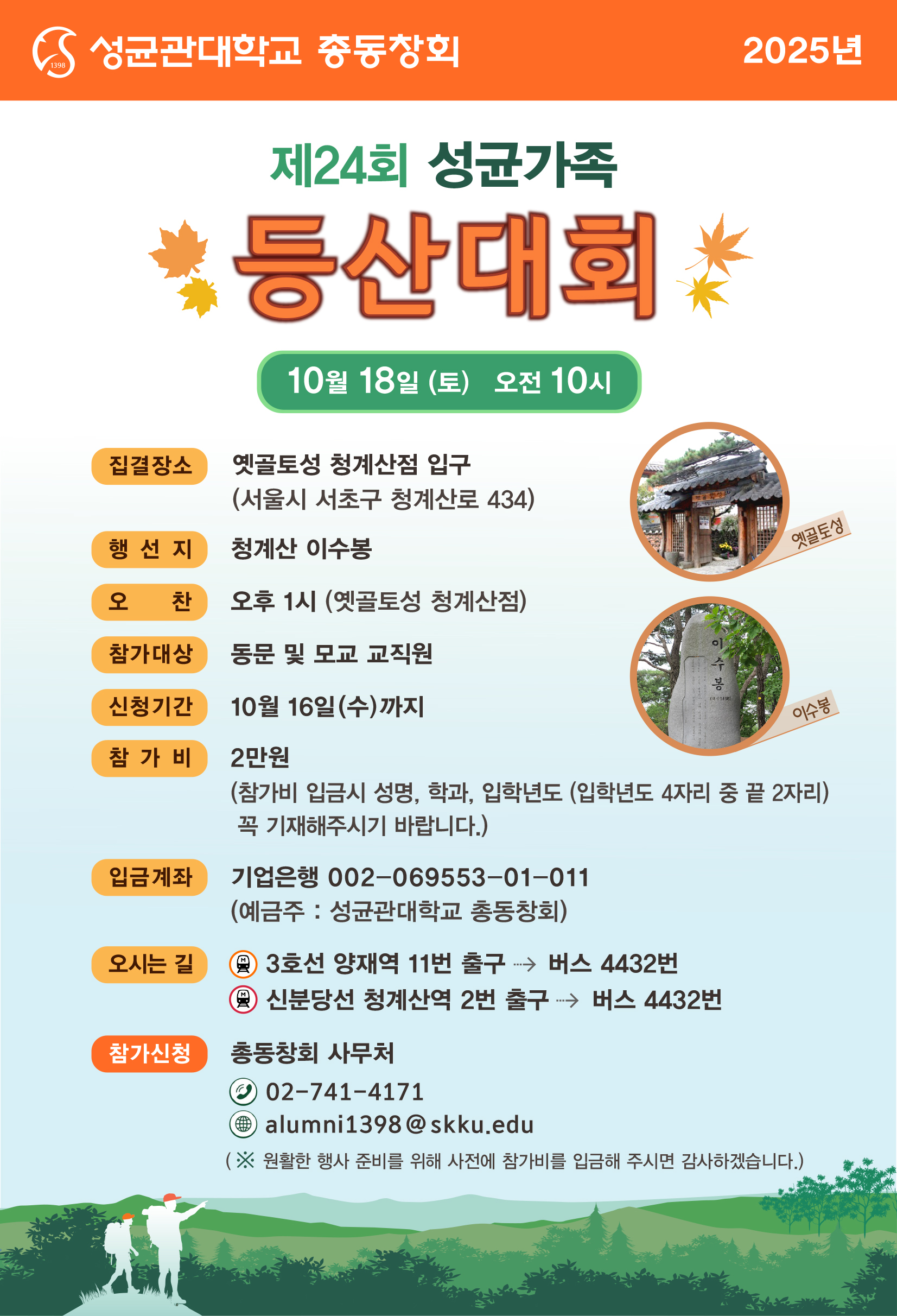 참가 신청 및 문의는 총동창회 사무처(전화 (02)741-4171, 이메일 alumni1398@skku.edu)로 하면 된다.