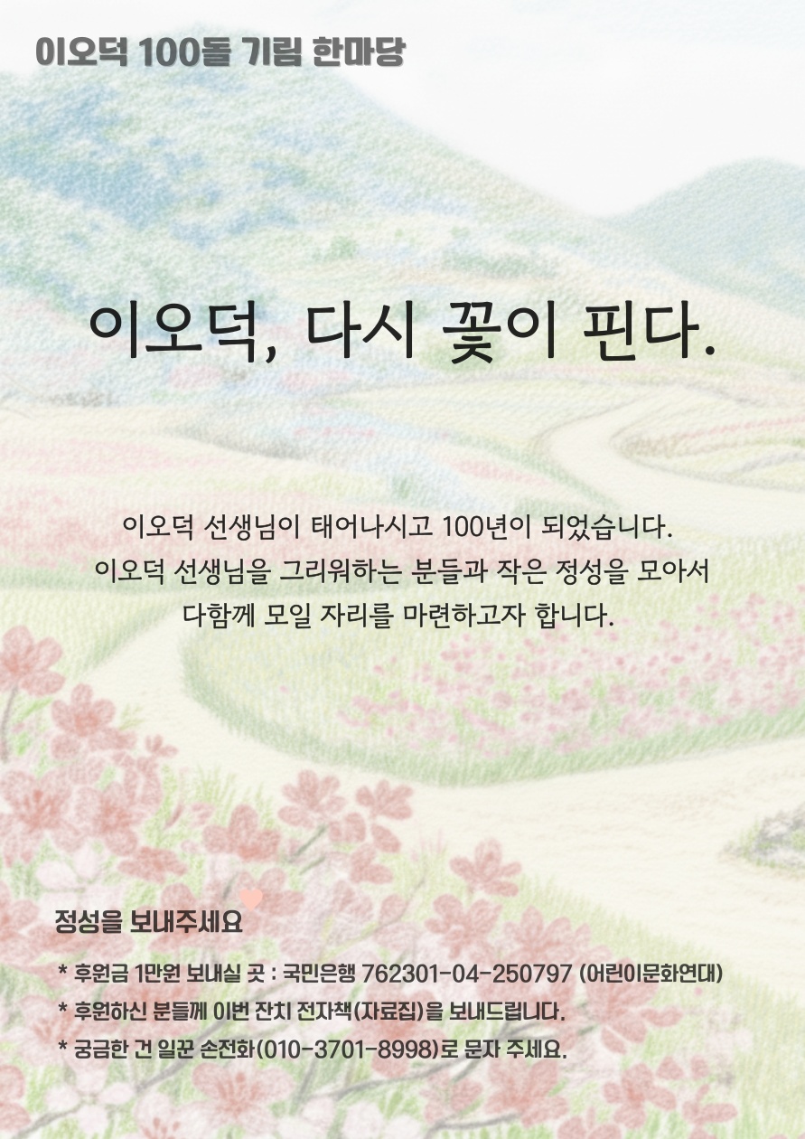 행사 준비위원회는 “이오덕 선생이 태어나신 지 100년이 되는 뜻깊은 해를 맞아 선생이 남긴 어린이 문학 정신과 교육 철학을 다시 되새기고자 한다”며 “많은 이들의 참여와 관심을 바란다”고 전했다.
