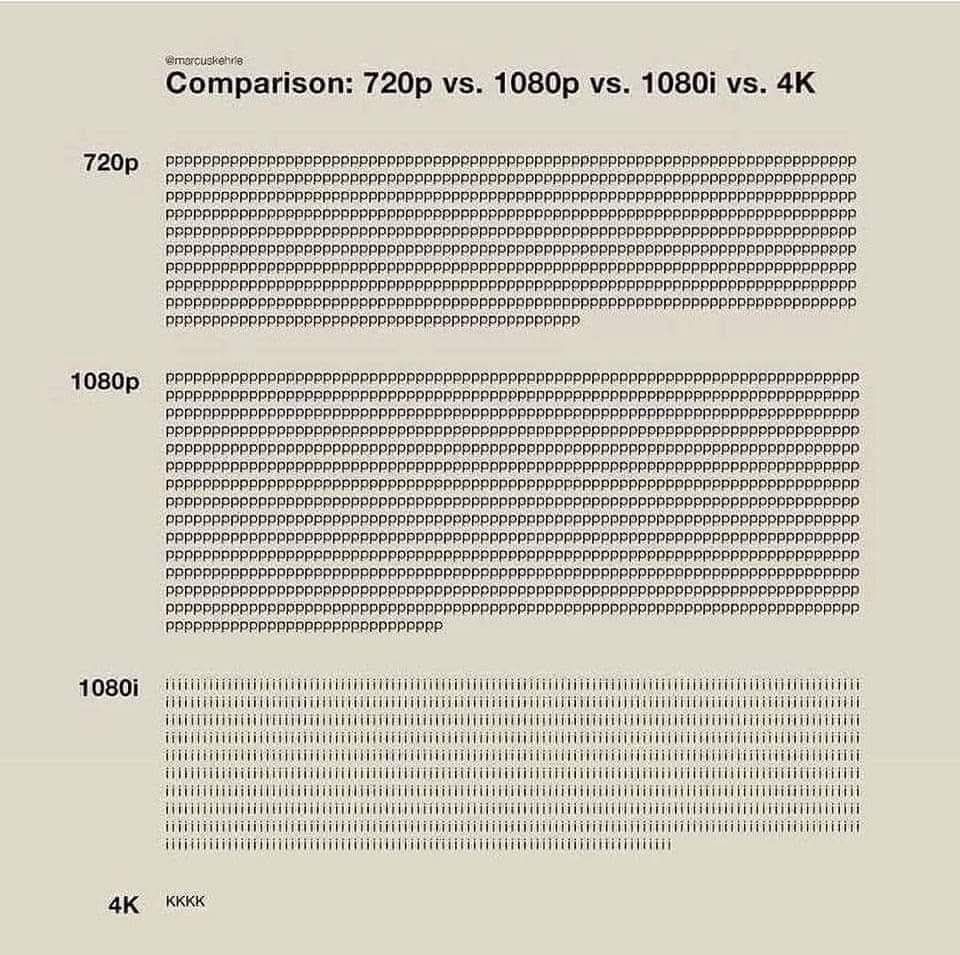 ‘720p’의 ‘p’는 progressive scan, 즉 화면의 모든 줄을 한 번에 그리는 방식을 뜻한다. ‘1080p’는 같은 방식이지만 더 많은 줄과 픽셀을 사용해 훨씬 선명한 영상을 구현한다. 반면 ‘1080i’의 ‘i’는 interlaced scan, 즉 홀수 줄과 짝수 줄을 번갈아 표시하는 구방식이다. 브라운관 TV 시절의 잔상과 깜빡임이 바로 이 방식의 한계다. 마지막으로 ‘4K’는 가로 해상도가 약 4000픽셀에 달하며, 1080p의 4배에 이르는 정보량을 담는다. 이미지 속 ‘KKKK’는 그 압도적 차이를 한눈에 드러내는 상징적 농담이다.