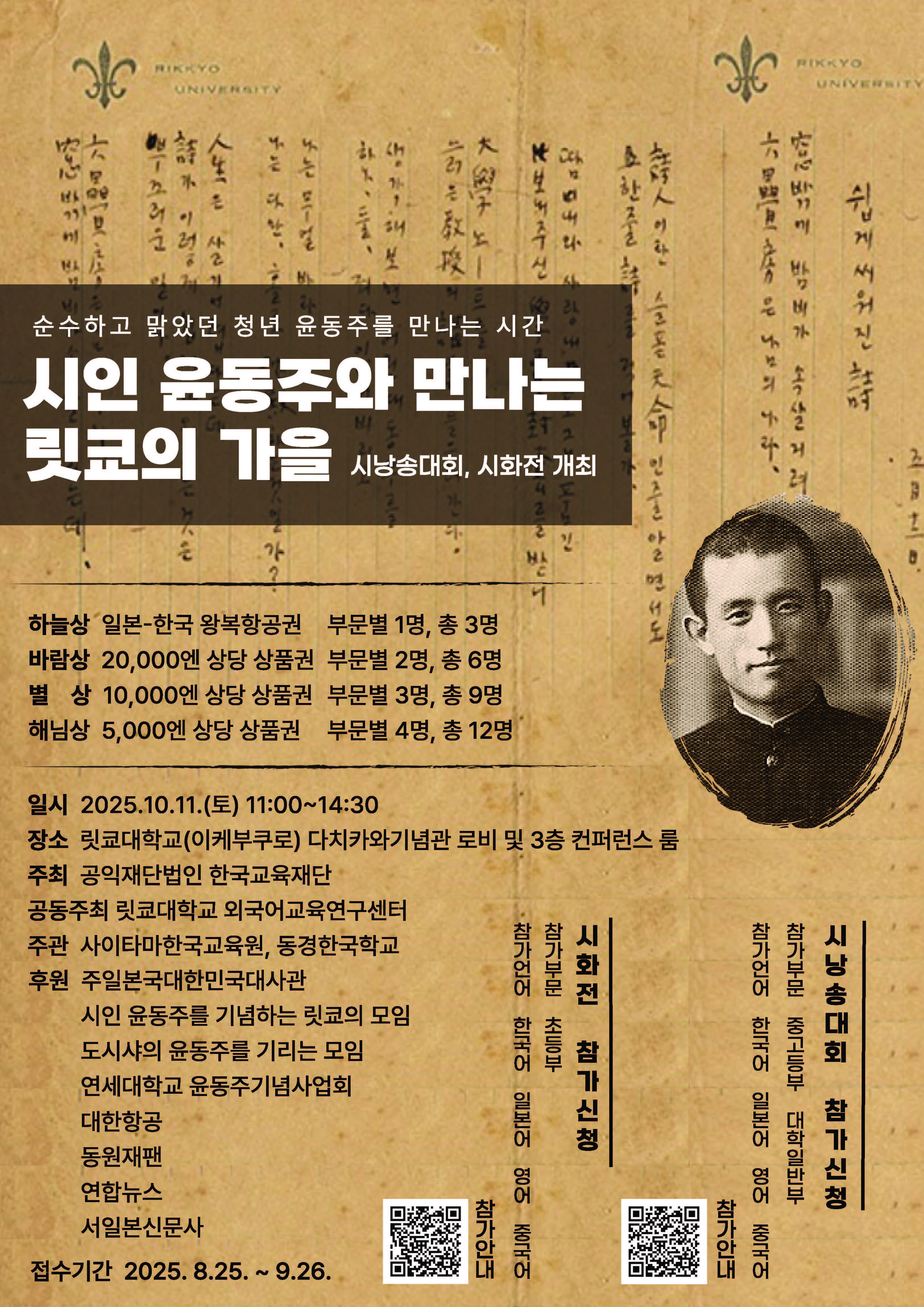 도쿄 릿쿄대학에서 오는 10월 11일 시인 윤동주를 기리는 가을 행사가 열린다. ‘시인 윤동주와 만나는 릿쿄의 가을’이라는 제목으로 열리는 이번 행사는 시낭송대회와 시화전을 통해 순수하고 맑았던 청년 윤동주의 시 정신을 기리는 데 초점을 맞췄다.