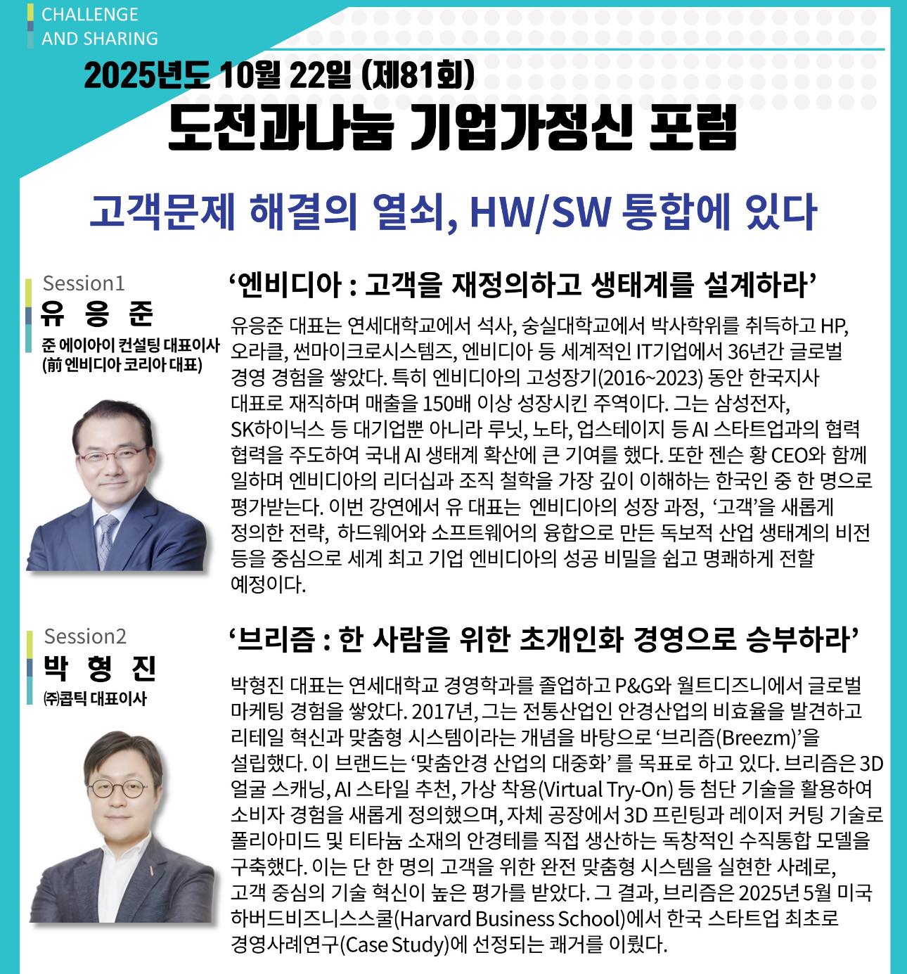 첫 번째 세션은 전 엔비디아 코리아 대표이자 현 준에이아이컨설팅 유응준 대표가 맡는다. 그는 ‘엔비디아 : 고객을 재정의하고 생태계를 설계하라’라는 주제로, 세계적 AI 반도체 기업 엔비디아의 기술 전략과 생태계 구축 과정을 분석한다.