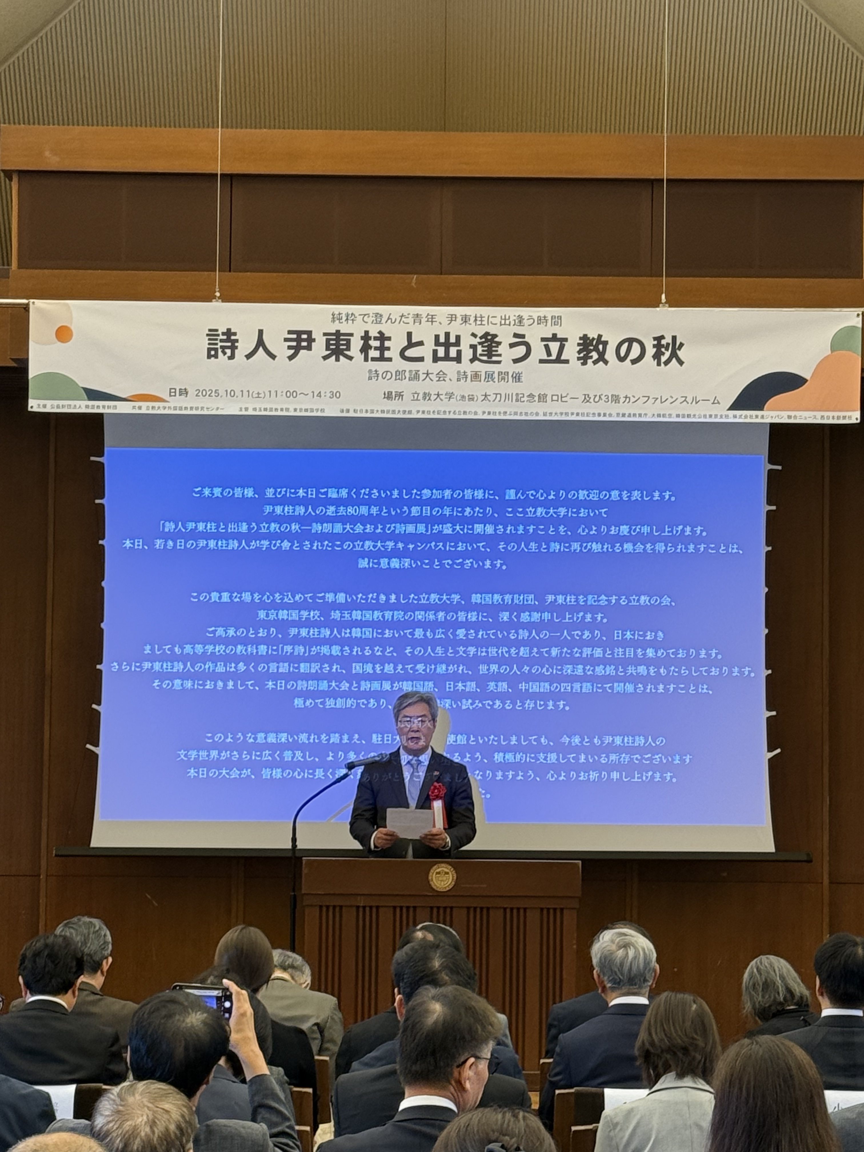 이혁 주일한국대사(대독: 양호석 수석교육관)는 “윤동주는 한국에서 가장 사랑받는 시인이자 일본에서도 존경받는 인물”이라며 “그의 시 ‘하늘과 바람과 별과 시’는 양국의 마음을 잇는 다리”라고 강조했다.