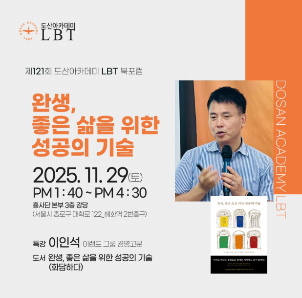도산아카데미는 오는 11 월 29 일(토) 오후 1 시 40 분, 흥사단 본부 강당(3 층, 서울종로구 대학로 122, 4 호선 혜화역 2 번 출구)에서 이인석 대표를 초청해 북포럼특별강연을 개최한다. 이번 강연은 『완생, 좋은 삶을 위한 성공의 기술(화담하다)』의저자이자 실천적 리더십 전문가인 이인석 대표(현 이랜드그룹 경영고문)가 “완생, 좋은삶을 위한 성공의 기술”을 주제로, 개인의 성장과 자기 실현을 넘어 ‘완전한 삶’을이루는 데 필요한 통찰과 실천 전략을 함께 나누는 시간으로 마련된다.