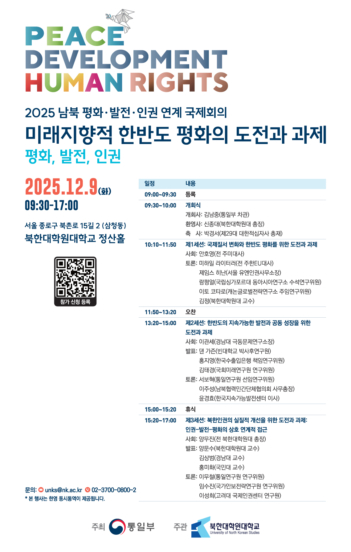 2025년 12월 9일, 서울 종로구 삼청동 북한대학원대학교 정산홀에서 남북 평화·발전·인권을 아우르는 국제회의가 열린다. ‘미래지향적 한반도 평화의 도전과 과제’를 주제로 열리는 이번 회의는 통일부와 북한대학원대학교가 공동 주관하며, 국내외 연구자와 전·현직 외교·안보 전문가들이 대거 참여한다.