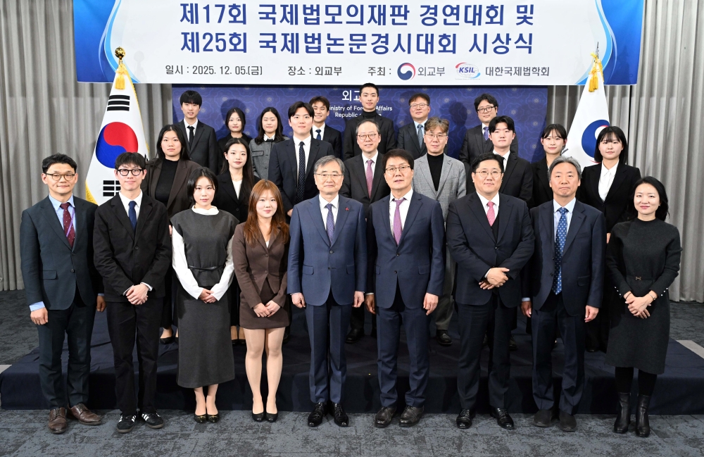 2025년 국제법 모의재판 경연대회와 국제법 논문경시대회 시상식이 12월5일 오후 외교부 청사 18층 서희홀에서 열렸다. 외교부와 대한국제법학회가 공동 주최한 이번 행사에는 조현 외교부장관과 박병도 학회장 등 학계 관계자들이 참석했다.