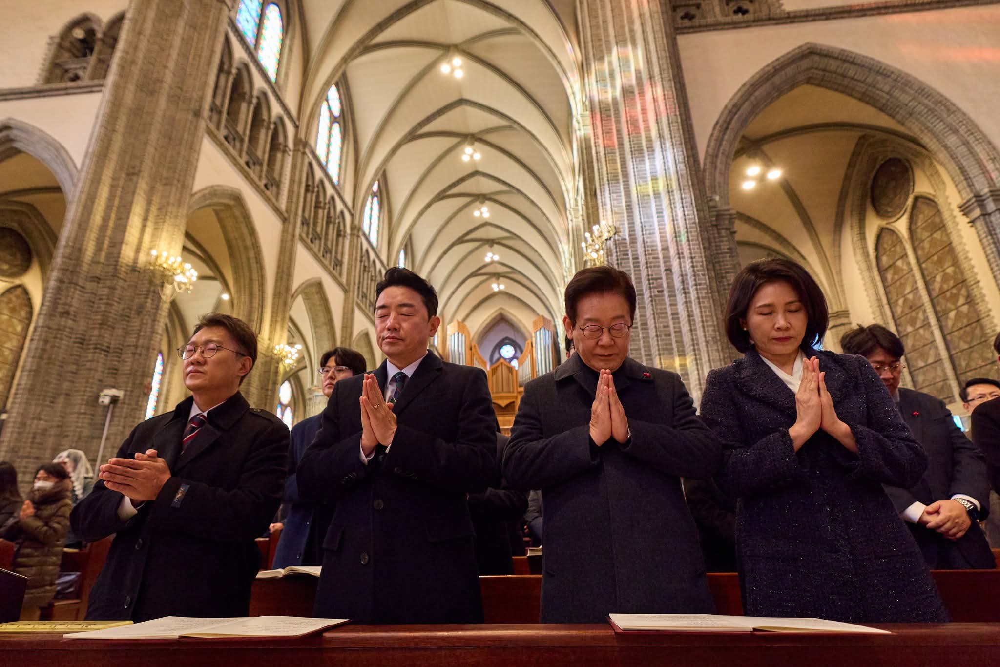 이날 오전에는 김혜경 여사와 함께 인천 계양구 해인교회를 찾아 성탄 예배에 참석했다. 해인교회는 1986년 노동자들이 뜻을 모아 설립한 민중교회로 알려져 있다.