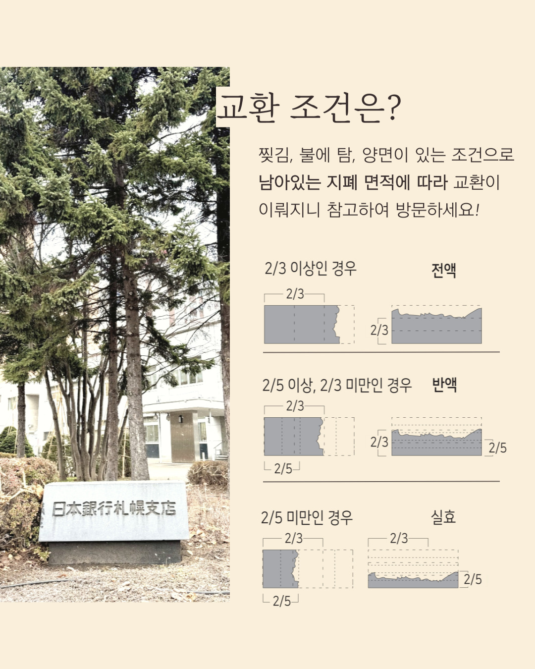일본 여행 중 찢어지거나 훼손된 일본 지폐는 한국 내 금융기관에서는 교환이 불가능한 것으로 확인됐다. 이에 따라 사용하지 못한 채 보관 중인 훼손 지폐가 있다면 일본 현지에서 직접 교환 절차를 밟아야 한다.
