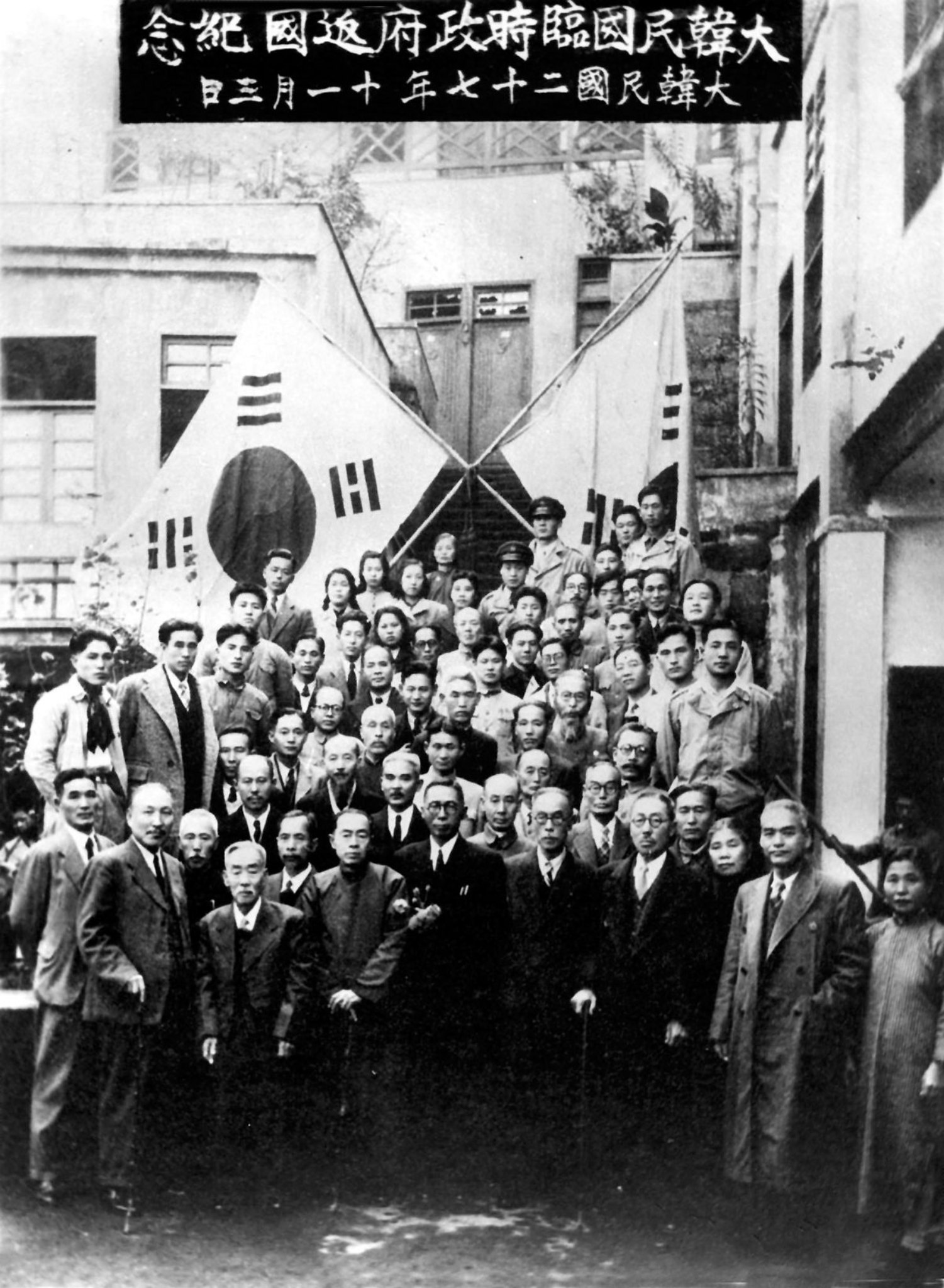 이 사진은 1945년 11월 23일, 중국 충칭에서 환국을 앞둔 대한민국 임시정부 요인들이 함께 촬영한 기념사진이다. 태극기 아래 모인 얼굴들에는 해방의 환희보다 오랜 투쟁이 남긴 시간의 무게가 먼저 읽힌다.