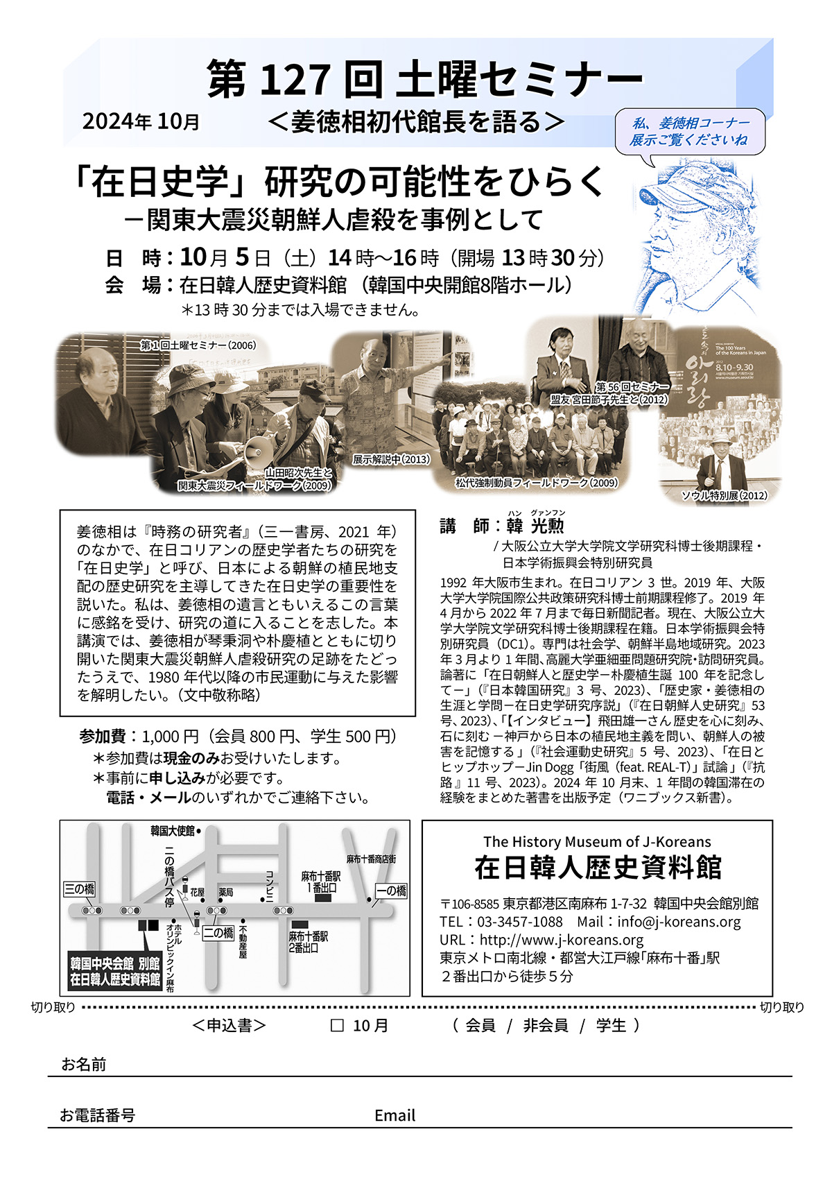 이번 강연은 재일코리안 역사학자 강덕상이 ‘시무의 연구자’에서 강조한 재일사학의 중요성을 재조명하고, 강덕상과 더불어 금병동, 박경식이 함께 연구해온 관동대지진 조선인 학살에 대한 연구 발자취를 되돌아보며 1980년대 이후 시민운동에 미친 영향에 대해 이야기할 예정이다.