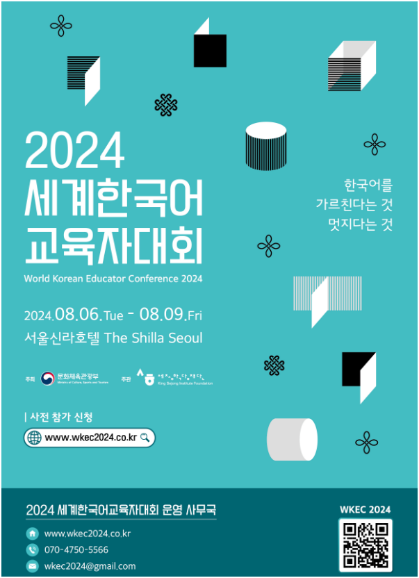 2024년 8월 6일부터 9일까지 서울 신라호텔에서 ‘2024 세계한국어교육자대회’가 열린다. 이번 대회의 주제는 “한국어를 가르친다는 것 멋지다는 것”이다. 이 대회는 한국어 교원과 한국어 교육에 관심 있는 사람들을 대상으로 한다.