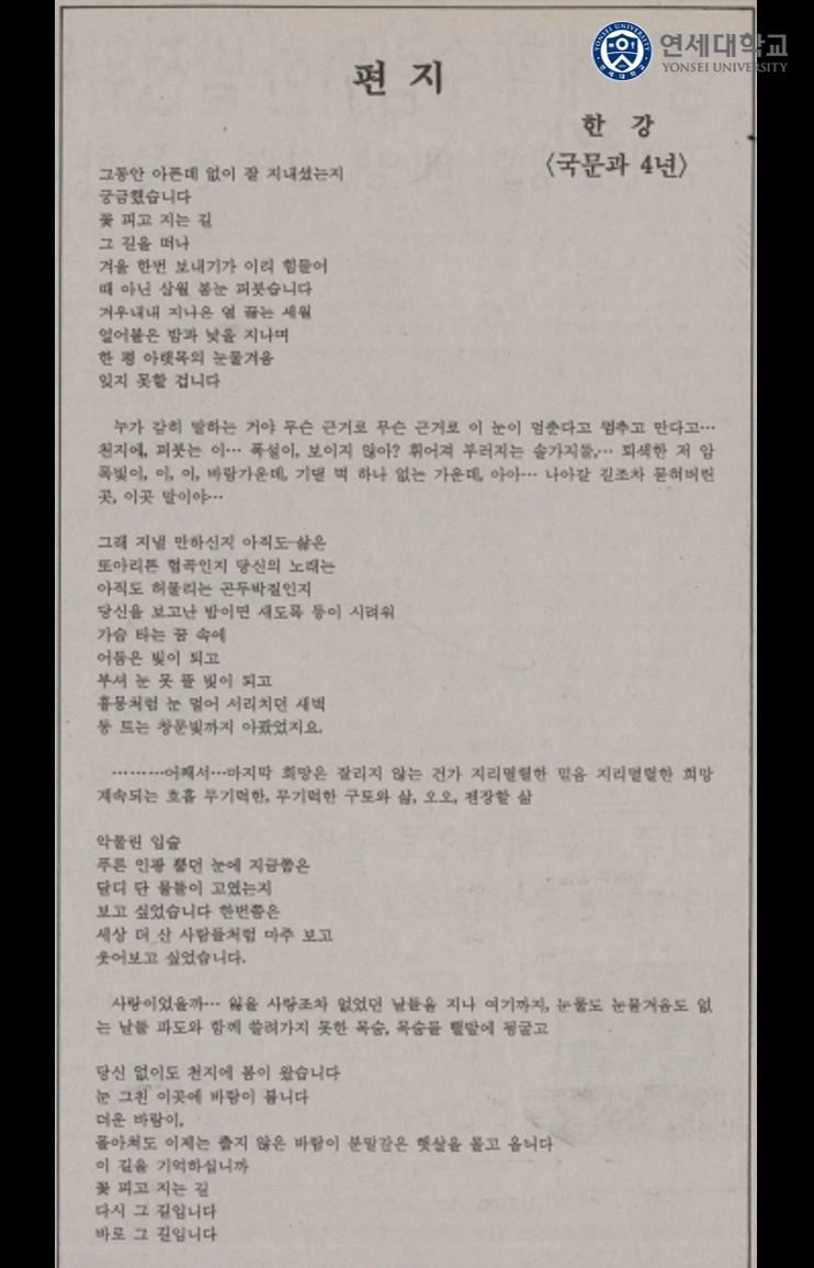 한강 작가가 한국 최초로 노벨 문학상을 수상하며 아시아 여성 최초라는 새로운 역사를 썼다. 1992년 연세대학교 국어국문학과 4학년에 재학 중이던 그녀는 연세춘추가 주관하는 연세문학상을 수상하며 문단에 등장했고, 이번 수상으로 한국 문학의 위상을 세계적으로 알리는 계기를 마련했다.