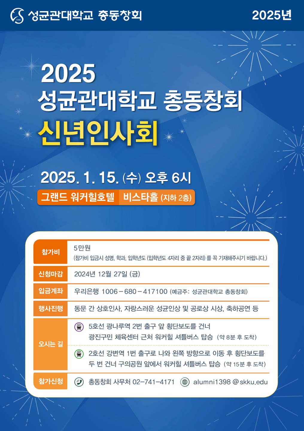 행사 참가비는 5만 원이며, 참가 신청은 2024년 12월 27일(금)까지 가능하다. 참가비 입금 시에는 참가자의 성명, 학과, 입학년도 등 기본 정보를 기재해야 한다. 입금 계좌는 우리은행 1006-680-417100 (예금주: 성균관대학교 총동창회)이다.