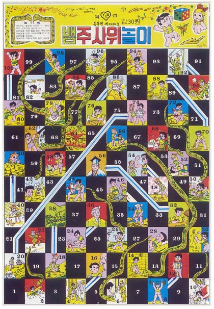 어릴 때 즐기던 추억의 놀이들이 많다. 그중에서도 뱀 주사위놀이를 빼놓을 수 없다. 주사위를 던져서 100번까지 먼저 가는 사람이 이기는 게임이다. 좋은 일을 하면 상을 받아 몇 칸을 훌쩍 도약하는 넘는 기회는 13번이며 나쁜 일을 해서 벌을 받아 뒤로 돌아가는 경우는 12번이었다.