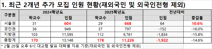 한국대학교육협의회가 발표한 대학별 추가모집 자료(재외국민 및 외국인 전형 제외)를 분석한 결과, 올해 서울권 추가모집 인원은 29개 대학 668명으로 지난해보다 64명(10.6%) 증가했다. 반면, 비수도권은 112개 대학 9761명으로 지난해보다 1834명(15.8%) 감소했으며, 경인권도 37개 대학 797명으로 지난해보다 152명(16.0%) 줄었다.