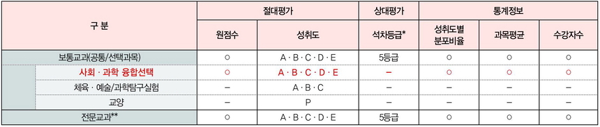 중학교 내신은 절대평가로 이루어지지만, 고등학교에서는 상대평가가 적용된다. 특히 공통과목과 일반선택과목뿐만 아니라 진로선택과목과 융합선택과목(사회·과학 교과 제외)도 상대평가를 적용받는다.