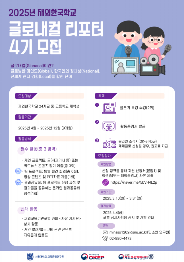 기타 문의는 재외교육기관포털 민소연 연구원에게 이메일(minsso1202@snu.ac.kr) 또는 전화(02-880-4473)로 하면 된다.