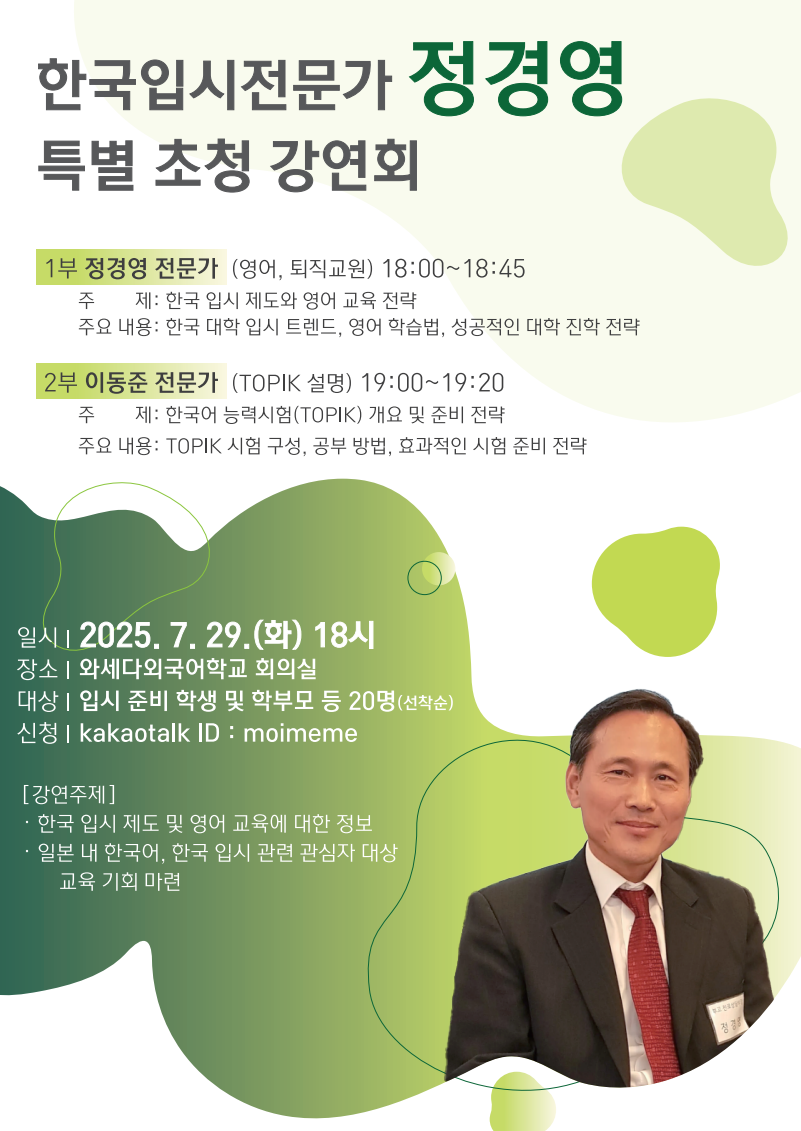 한국 입시 전문가 정경영이 오는 7월 29일 일본 도쿄 와세다외국어학교에서 특별 초청 강연회를 연다. 이번 강연회는 한국 대학 진학을 준비하는 학생과 학부모를 대상으로 하며, 영어 및 한국어 교육에 관한 실질적인 정보를 제공할 예정이다.