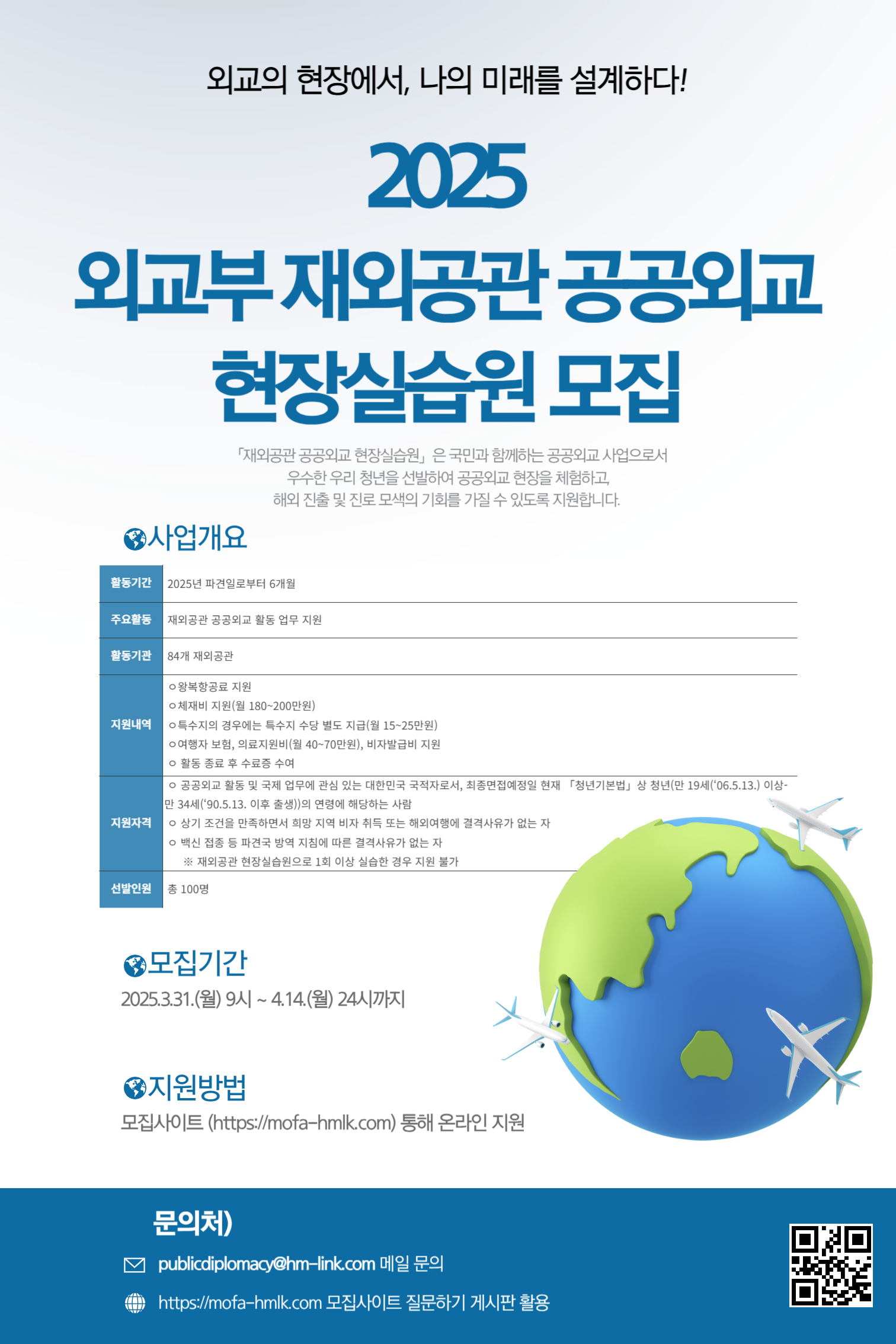 총 선발 인원은 약 100명이며, 지원은 외교부 지정 모집사이트(https://mofa-hmlk.com)를 통해 온라인으로만 가능하다. 자세한 문의는 이메일(publicdiplomacy@hm-link.com) 또는 모집사이트 내 게시판을 통해 할 수 있다.