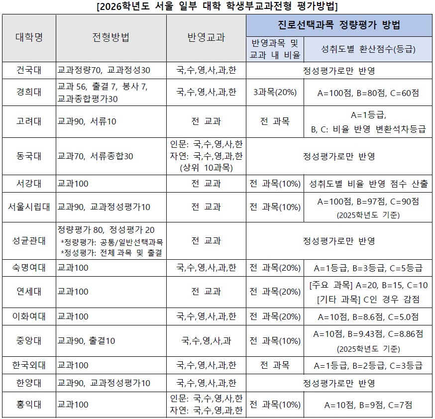 진로선택과목은 등급이나 표준편차가 제시되지 않기 때문에, 대학마다 정량·정성평가 활용 방식이 다르다. 숙명여대는 전년도까지 3과목만 반영했으나, 2026학년도에는 관련 전 과목을 평가에 반영한다. 반면, 건국대·동국대·성균관대·한양대는 정성평가로만 진로선택과목을 활용하고, 성취도(A/B/C)는 정량평가에 사용하지 않는다.