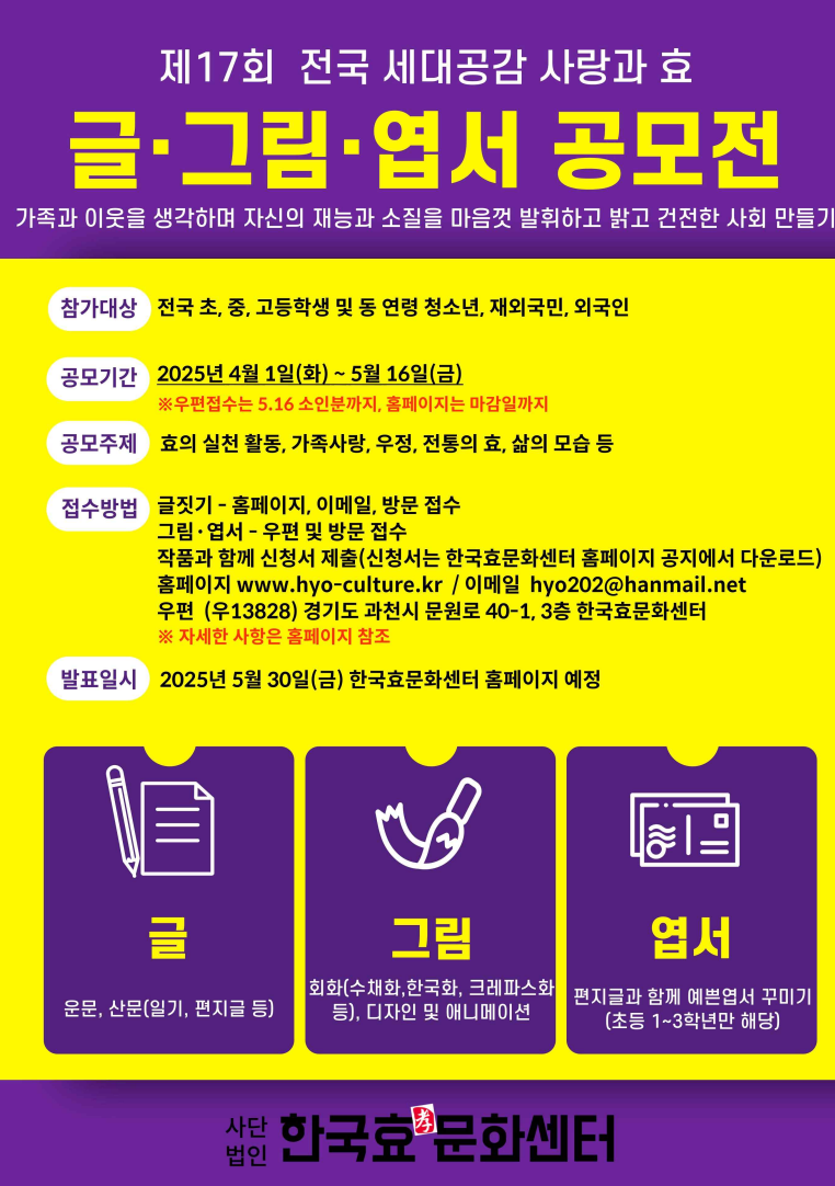 제17회 ‘세대공감 사랑과 효 공모전’이 4월 1일부터 5월 16일까지 열린다. 이번 공모전은 사단법인 한국효문화센터가 주최·주관하며, 가족과 이웃을 생각하는 마음을 바탕으로 청소년들의 창의적 표현을 장려하고 건전한 사회 문화를 조성하자는 취지로 진행된다.