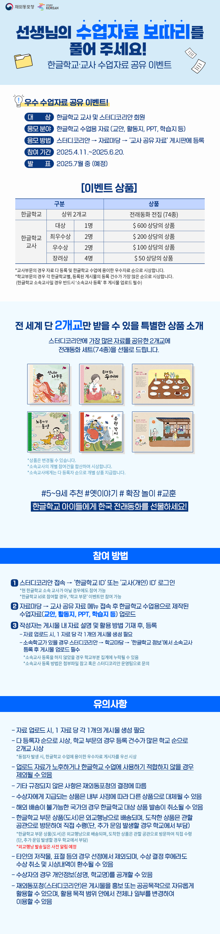 참여 기간은 2025년 4월 11일부터 6월 20일까지이며, 수상자는 7월 중 발표된다. 한글학교 부문에서는 등록 건수가 가장 많은 2개교를 선정해 전래동화 전집(74종)을 증정하고, 교사 부문은 대상(1명, 600달러 상당), 최우수상(2명, 200달러 상당), 우수상(2명, 100달러 상당), 장려상(4명, 50달러 상당)의 시상이 이뤄진다.