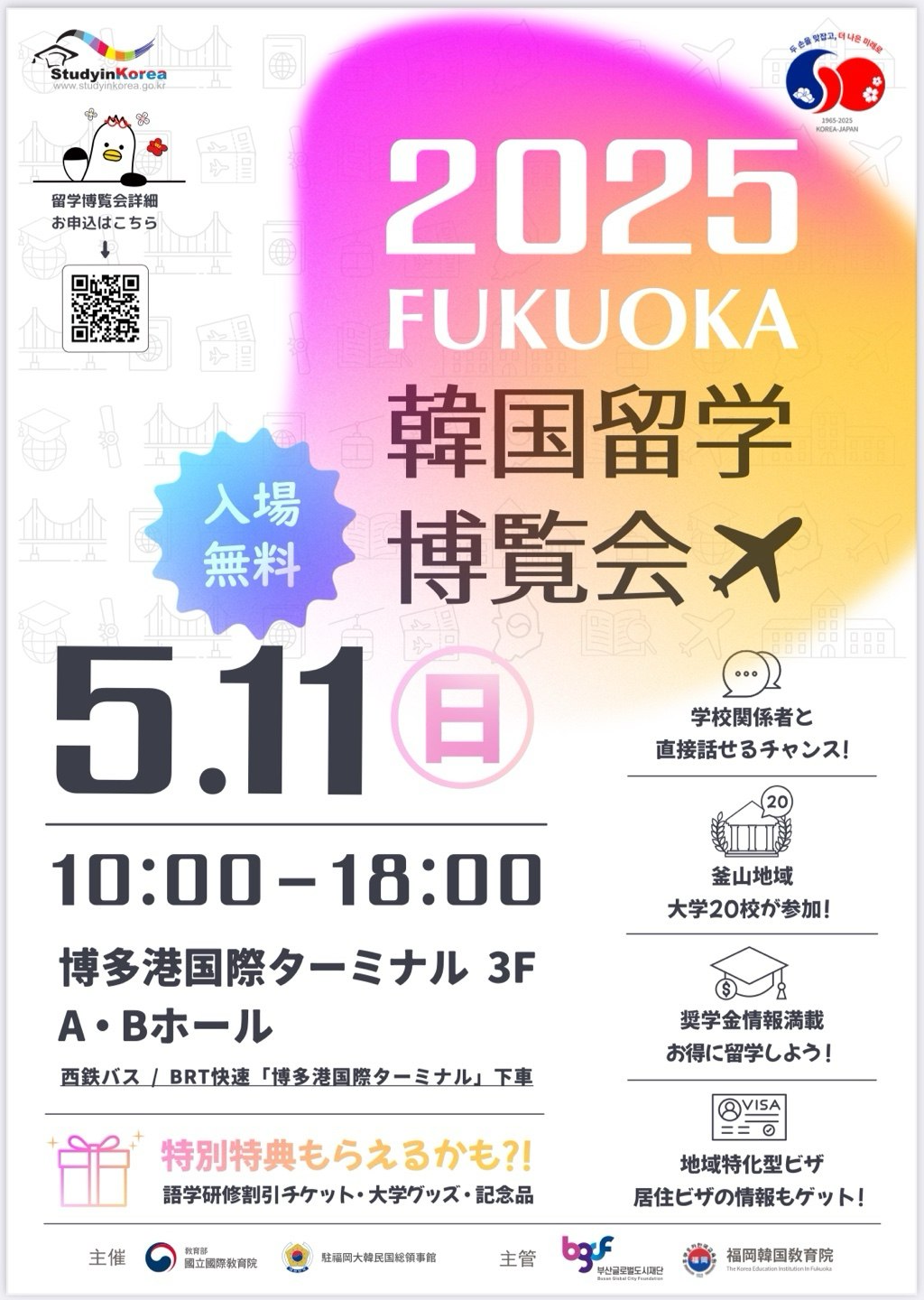 한국 유학에 관심 있는 일본 현지 학생과 학부모를 위한 ‘2025 후쿠오카한국유학박람회’가 오는 5월 11일 일본 후쿠오카 하카타항국제터미널 3층 A, B홀에서 열린다.
