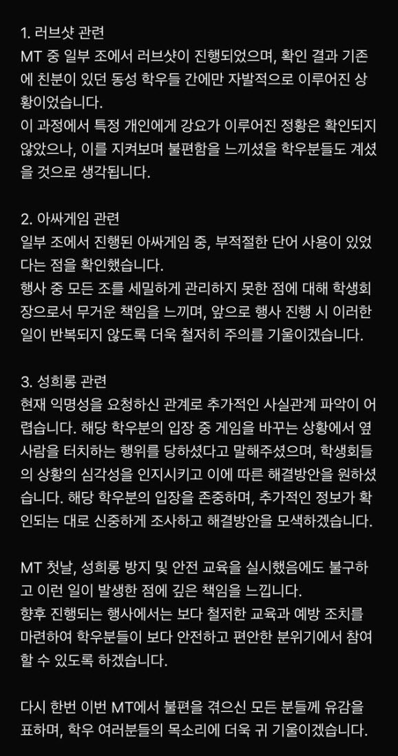 학생회의 첫 대응은 사과였다. 해당 학과 학생회는 “첫날 성희롱 예방 교육을 했음에도 이런 일이 발생해 깊은 책임을 느낀다”고 밝혔다. 이어 “러브샷은 일부 조 내에서 동성 간 자발적으로 이뤄졌고, 특정인에게 강요된 정황은 현재까지 확인되지 않았다”고 해명했다. 그러나 “모든 조를 세밀히 관리하지 못한 점은 반성하고 있으며, 재발 방지를 위해 노력하겠다”고 덧붙였다.