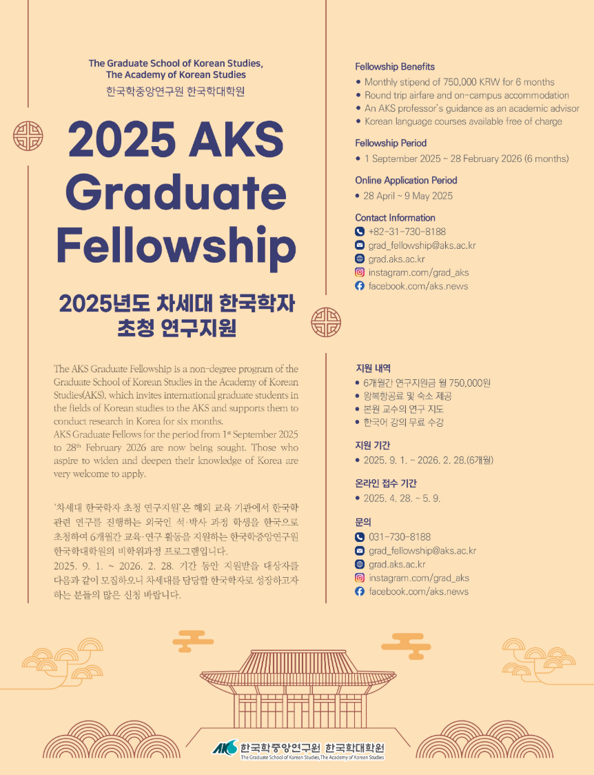 보다 자세한 사항은 한국학중앙연구원 교학실 김유진 담당자에게 이메일(grad_fellowship@aks.ac.kr) 또는 전화(+82-31-730-8188)로 문의하면 된다. 모집 요강은 국문과 영문 모두 한국학중앙연구원 홈페이지에서 확인할 수 있다.