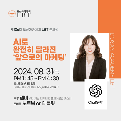 도산아카데미가 오는 8월 31일(토)에 AI마케팅디렉터, 셀피쉬클럽마스터 신주혜(젬마)를 모시고 AI로 완전히 달라진 ‘앞으로의 마케팅’ 의 주제로 특강 및 실습을 가진다.