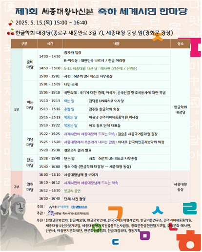 2부 열린 마당에서는 시민들이 직접 참여하는 ‘세종대왕님께 꽃 바치기’, ‘세계시민이 세종대왕께 드리는 약속’, 한창환 서예가의 ‘붓글씨 공연’ 등이 펼쳐질 예정으로 시민들의 관심과 참여를 기다리고 있다.