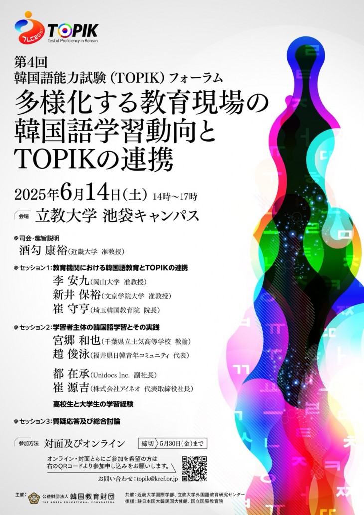 韓国語教育と評価制度の連携をテーマにした第4回 韓国語能力試験(TOPIK)フォーラムが、2025年6月14日(土)14時〜17時、立教大学池袋キャンパスにて開催されます。今回のフォーラムは対面およびオンラインのハイブリッド形式で行われます。