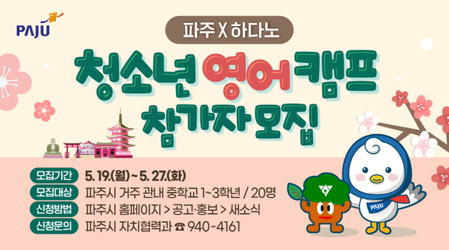 모집 대상은 파주시에 거주하며 지역 내 중학교에 재학 중인 1~3학년 청소년이며, 신청 기간은 19일부터 27일까지다. 참가자는 서류 심사와 면접을 거쳐 최종 선발되며, 선발된 인원에게는 영어캠프 참가비와 일본 왕복 항공료 일부가 지원된다.