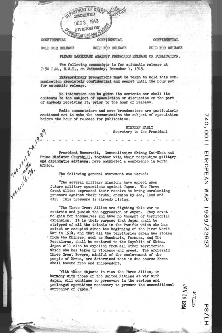 카이로 선언에서는 프랭클린 루스벨트 미국 대통령, 윈스턴 처칠 영국 총리, 장제스 중국 총통이 모여 일본의 침략 전쟁에 대한 강력한 응징을 결의했다. 이들은 일본이 불법적으로 점령한 모든 영토를 반환하고, 만주와 타이완 등 일본이 강탈한 중국 영토를 중국에 돌려줄 것을 명확히 규정했다. 특히, 한국(조선)에 대해서는 “적당한 시기에 독립시키기로 결정하였다”고 명시하여 조선의 독립 문제를 처음으로 국제사회에서 공식적으로 언급했다.