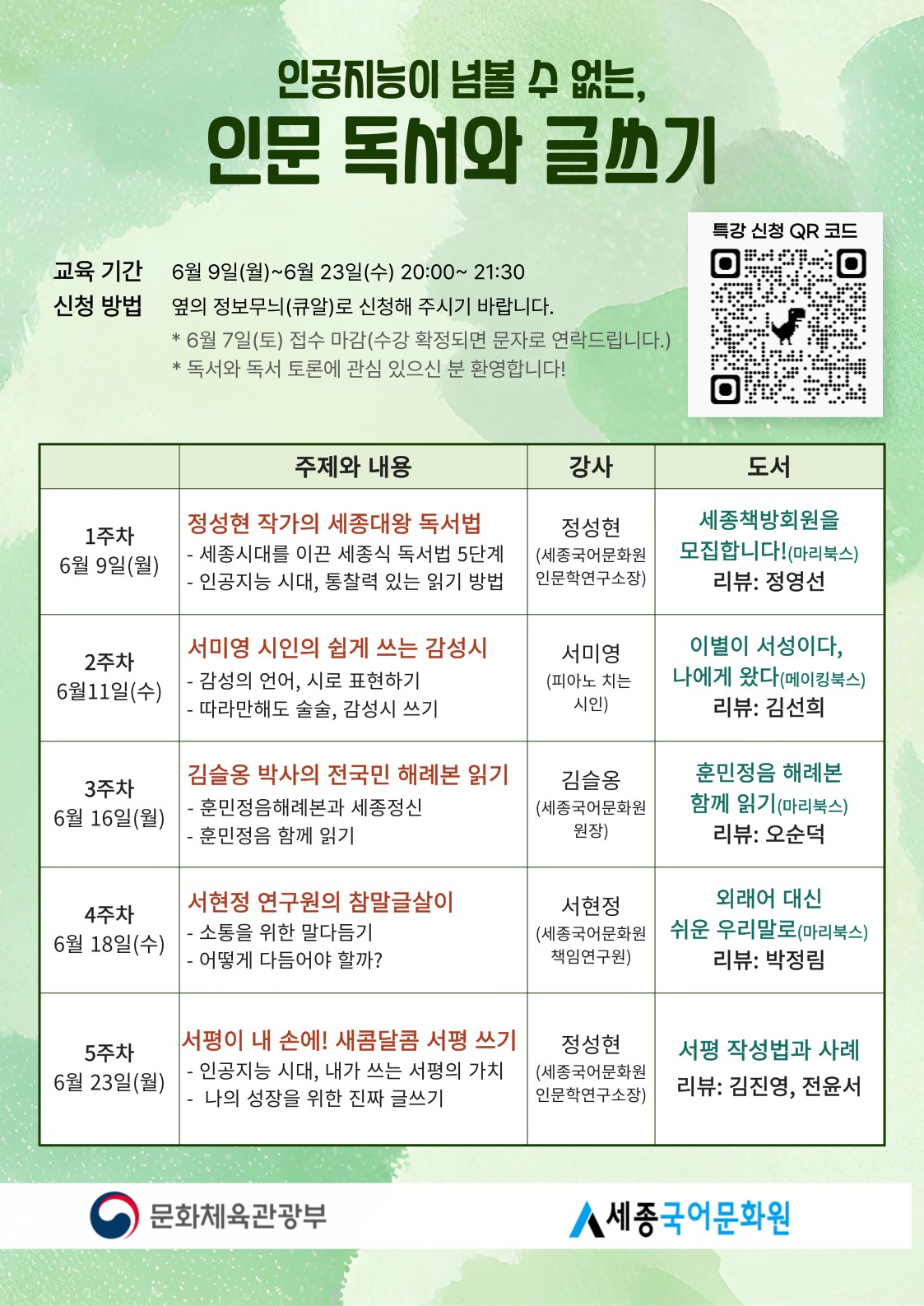 문화체육관광부와 세종국어문화원이 오는 6월 9일부터 23일까지 ‘인공지능이 넘볼 수 없는, 인문 독서와 글쓰기’라는 주제로 특별 강연을 진행한다.